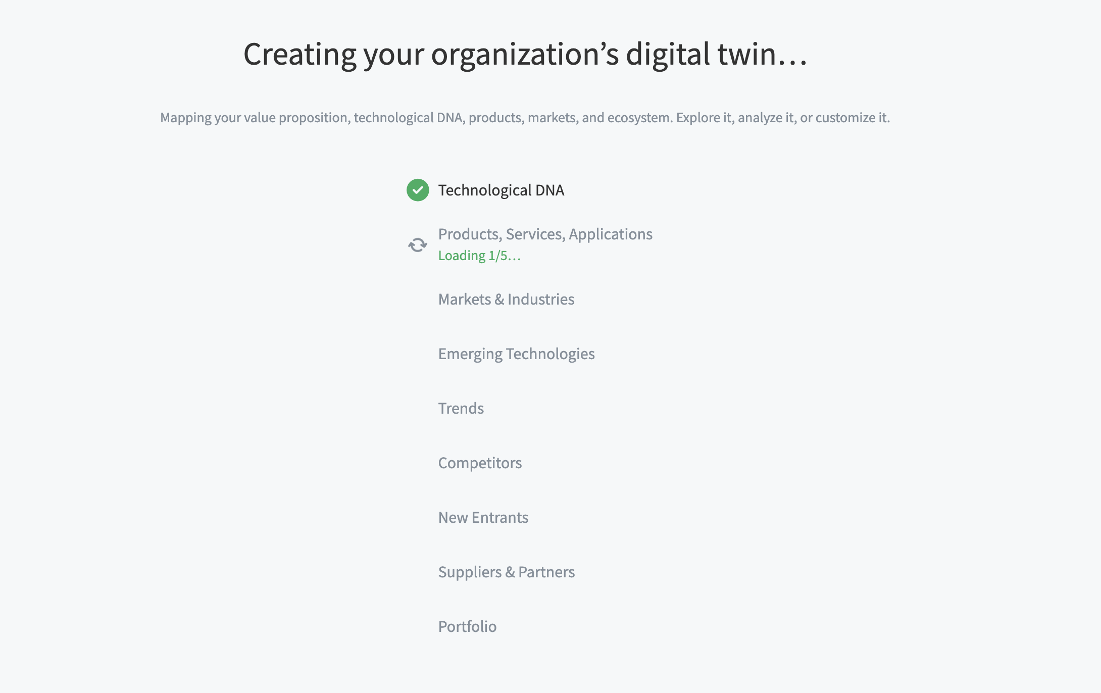 By providing your Organization URL, SCOUT maps your value proposition, technological DNA, products, markets, and ecosystem so you can start exploring and refining insights right away.