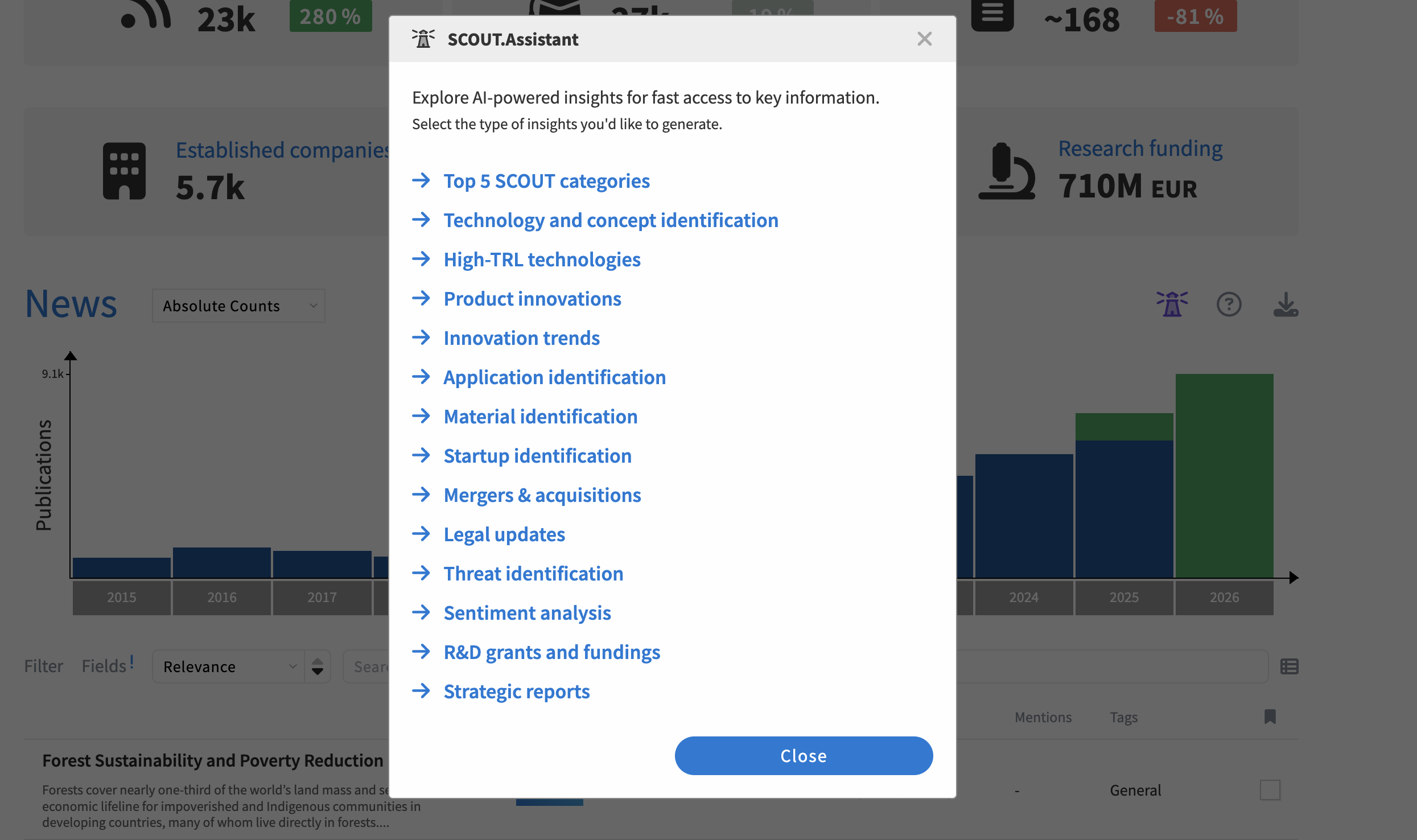 Inside each report, you’ll find visualizations, and rankings. Each subcategory has a tailored set of SCOUT panels (e.g., News, Research, Patents, Companies). Panels are designed to reflect the context of that subcategory.